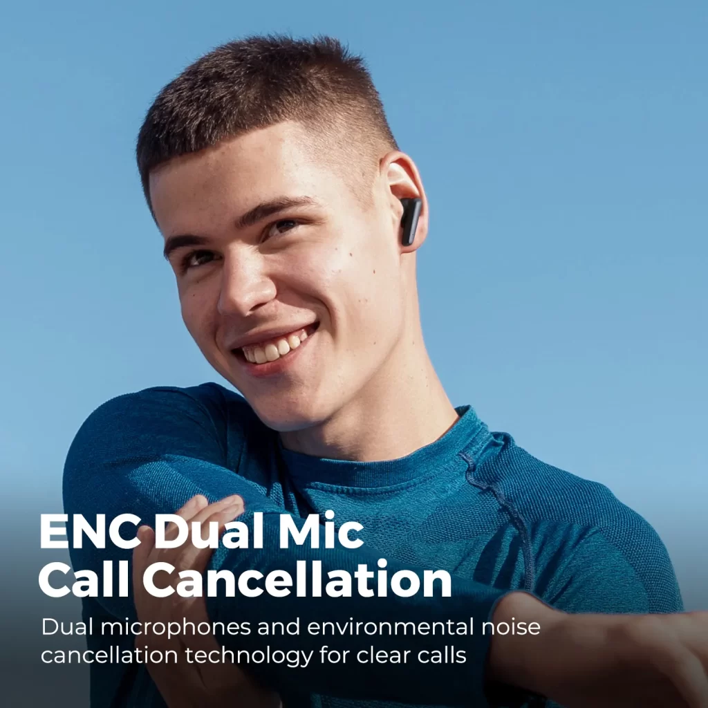 - Featuring dual ENC microphones, these earbuds ensure uninterrupted and natural-sounding calls. The environmental noise cancellation (ENC) technology reduces background noise, so every conversation is crisp and clear, no matter where you are.