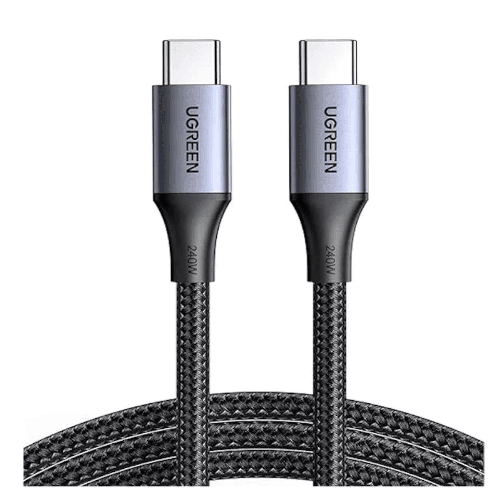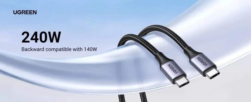 - The UGREEN 240W PD 3.1 USB-C to USB-C Cable (1 Meter) designed to keep up with the most advanced charging needs. With an impressive 240W (48V/5A) capacity, it supports the latest PD 3.1 technology, enabling you to replace multiple cables with just one. This high-wattage capability means that, regardless of your device, you can rely on this cable to deliver power quickly and efficiently. For instance, it charges a Nintendo Switch to 90%, a Samsung S20 to 96%, a MacBook Pro to 86%, and an iPad Pro to 89% in under 35 minutes. However, to fully benefit from this speed, a compatible C-port adapter with the appropriate power is necessary.