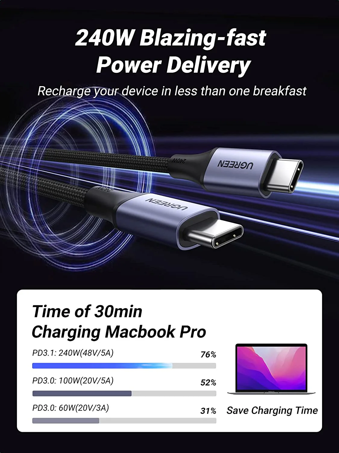 - The UGREEN 240W PD 3.1 USB C to USB C Cable (2 Meter) is an excellent choice for fast and reliable charging. It supports the latest PD 3.1 technology, providing up to 240W of power output (48V/5A). As a result, it allows you to charge your devices in record time. For example, devices like the Samsung S20, MacBook Pro, iPad Pro, and even the Nintendo Switch can achieve significant charge in less than 35 minutes. Moreover, with its advanced E-marker smart chip and integrated 56KΩ resistors, it ensures the protection of your devices from electrical damage.