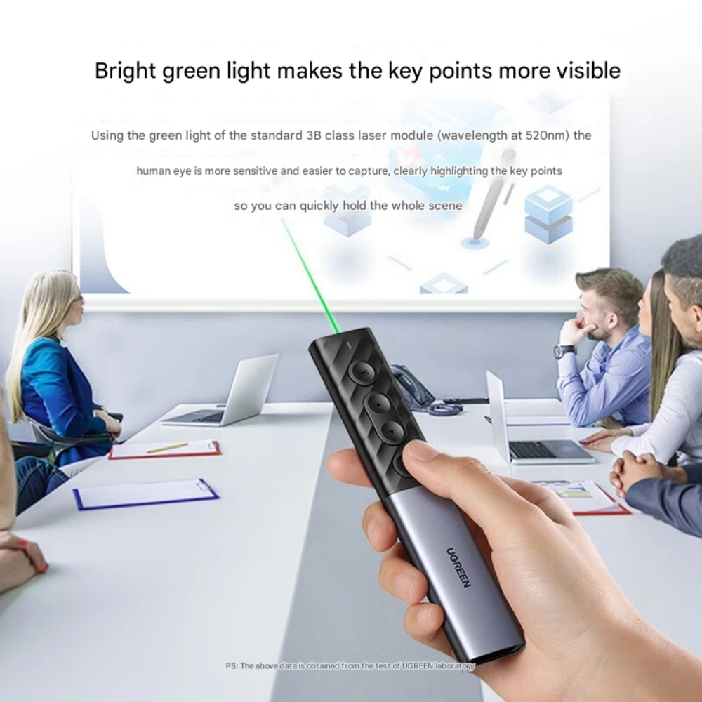- Take your presentations to the next level with the UGREEN Green Laser Wireless RechargeablePointer. Designed for professionals, educators, and business users, this device delivers exceptional performance, convenience, and control. Its powerful green laser offers superior visibility compared to standard red lasers, making it highly effective even in brightly lit environments or large conference rooms.