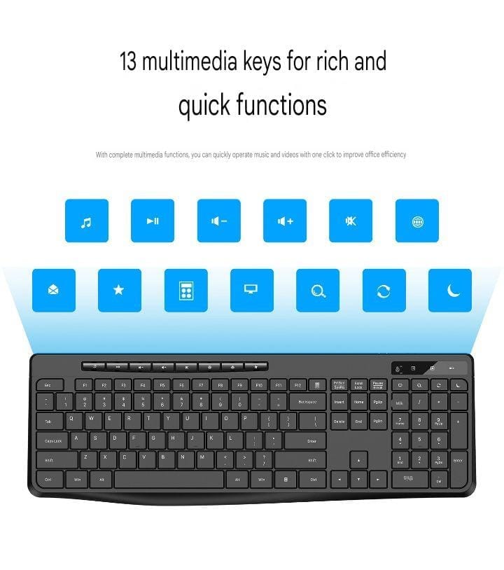 - In addition, the keyboard features 13 multimedia shortcut keys, enabling quick access to media controls like music and videos. This boosts your productivity and simplifies multitasking. The durable build ensures long-term reliability, while indicator lights keep you informed about caps lock and battery status. The mouse, equipped with silicone pads, is designed to resist wear and tear for prolonged durability.