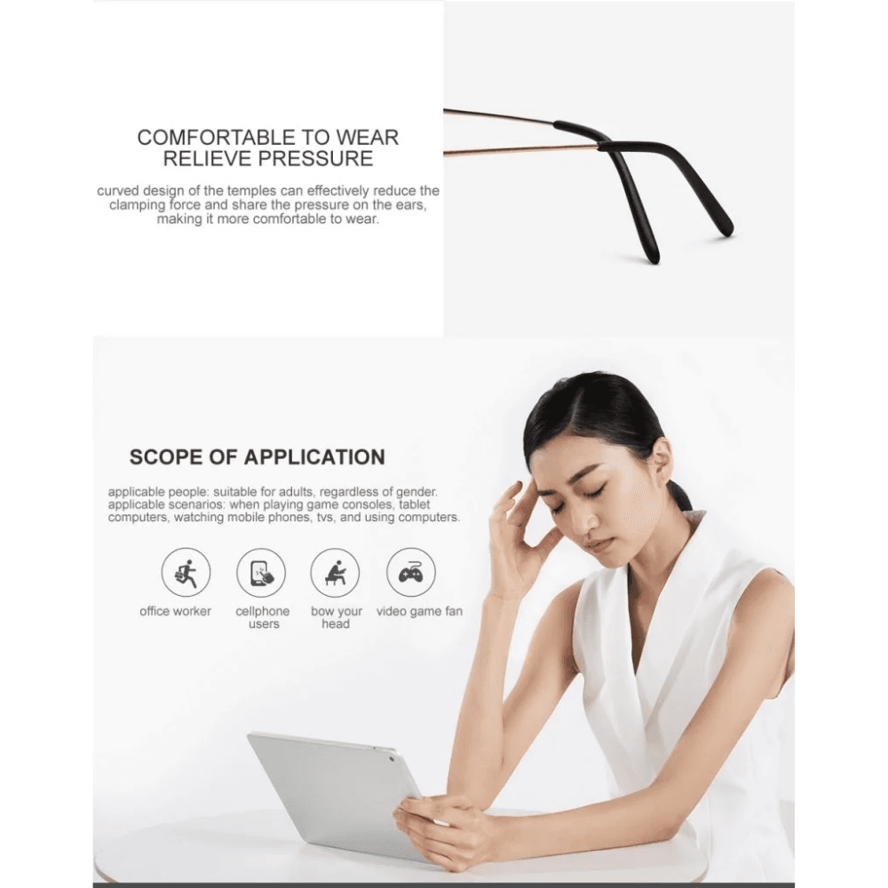 - The Xiaomi Mi Computer Glasses are a must-have accessory for anyone who spends long hours in front of screens. Designed with a 40% blue light blocking rate, these glasses help reduce eye strain and fatigue, making them ideal for use during work, study, or gaming sessions. Moreover, the gold-plastic hybrid frame provides both durability and a modern aesthetic, ensuring that the glasses look stylish while maintaining functionality.