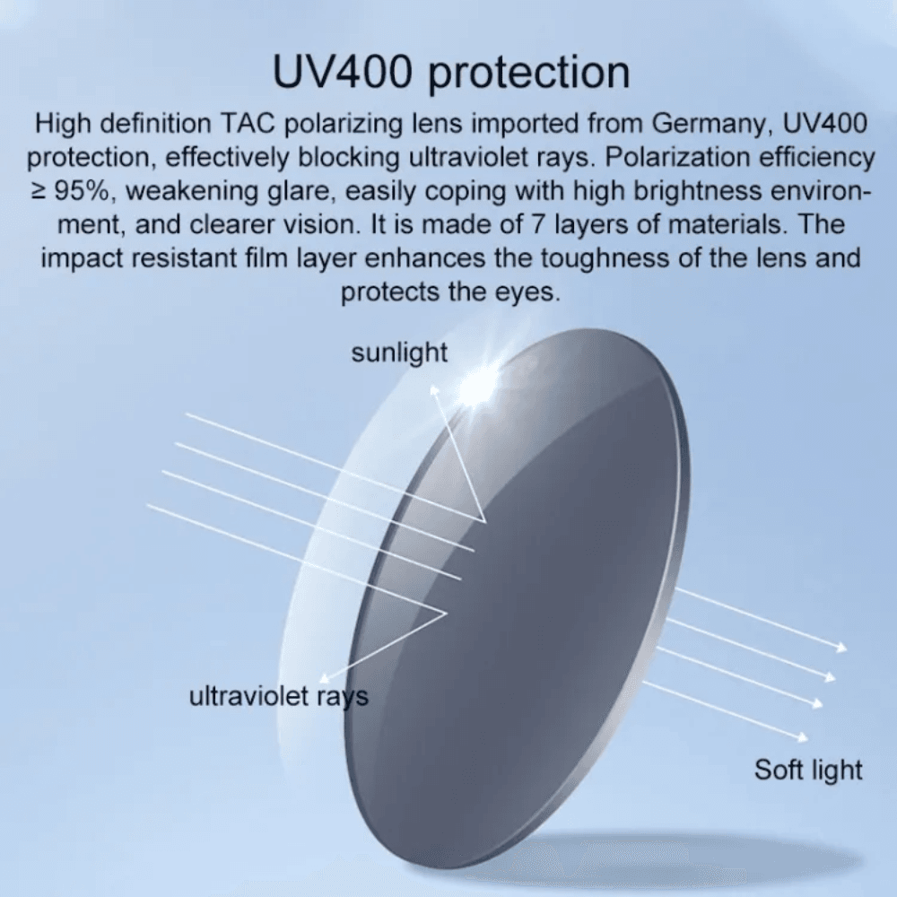 -  The polarization efficiency of the sunglasses is ≥95%, which means they can significantly reduce glare and harsh light. This feature ensures clearer vision even in bright environments. Additionally, the lenses have a seven-layer composite construction, including an impact-resistant film layer that enhances durability and provides long-term eye protection.
