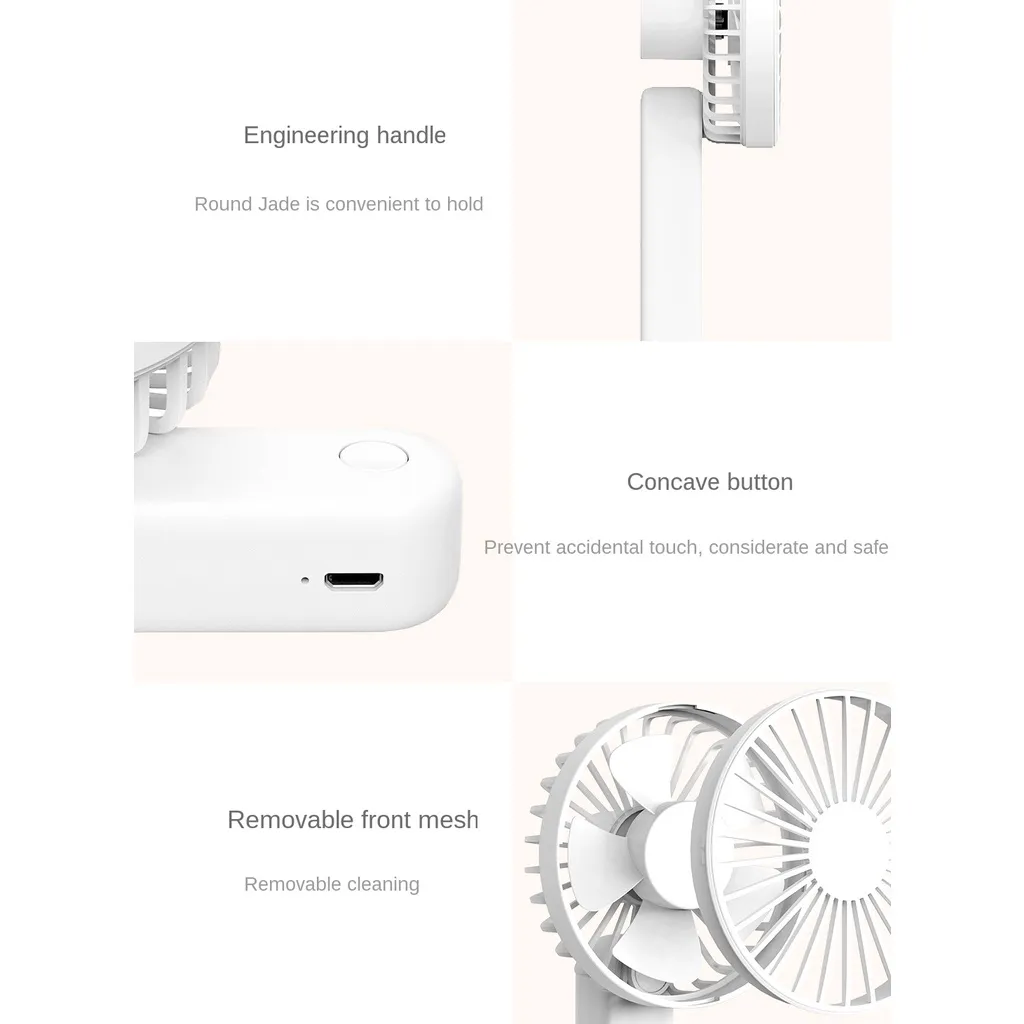 - Furthermore, the fan is equipped with a built-in 1200mAh battery and charges through a Micro USB interface. It can connect to various devices like a computer or power bank, ensuring you’re cool all day. This fan’s minimalist design, featuring a round, easy-to-hold handle and a concave key to prevent accidental touches, adds to its elegance.