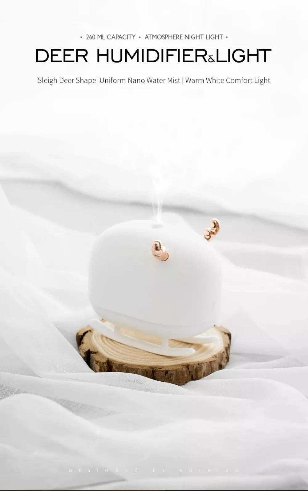 • Add charm and comfort to your personal space with the XiaomiSothing Deer Humidifier & Light – a delightful blend of design and function. Featuring a cute deer-inspired look with metallic antlers, this stylish humidifier not only enhances air quality but also doubles as a warm ambient night light.