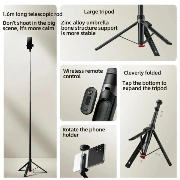 - With a telescopic rod stretching from 30cm to 160cm, it’s ideal for capturing wide-angle and large-scene shots effortlessly. The robust aluminum alloy construction ensures stability, complemented by a large-size chassis for added grip, even at maximum extension. Whether for group photos, landscapes, or solo shots, this tool adapts to your needs with ease.
