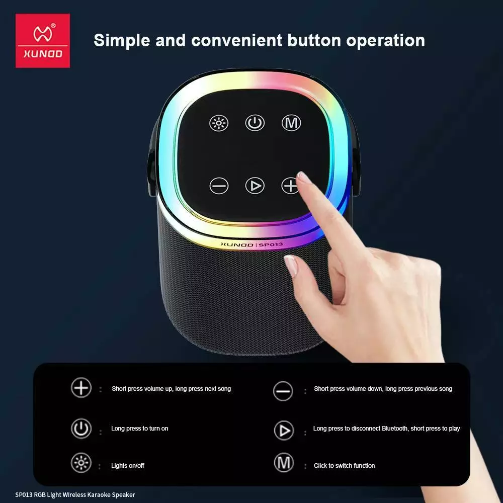 - The XUNDD SP013 RGB Wireless Karaoke Speaker is the perfect choice for music lovers and karaoke enthusiasts. Built with premium ABS and cloth, it offers durability and an elegant look. Whether you’re singing solo or with friends, the dual microphones provide a seamless karaoke experience.