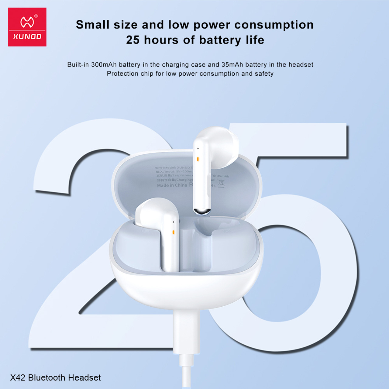 - Notably, the XUNDDX42 is built for long usage with low power consumption, delivering an impressive 25 hours of battery life on a full charge. The digital battery display keeps you informed at all times, while the compact charging case (300mAh) ensures your earphones are always ready to go.