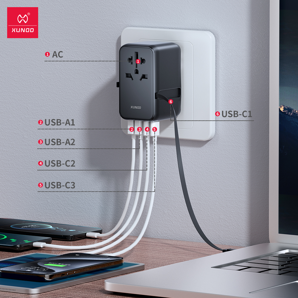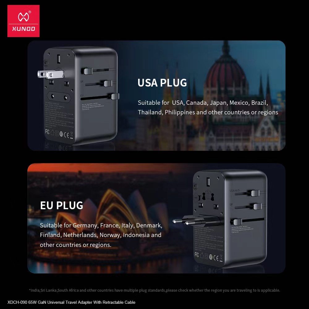 - The Xundd XDCH-090 65W GaN Universal Travel Adapter is a must-have for frequent travelers. Designed to work in over 220 countries, it supports US, EU, UK, and AUS plug standards, making it perfect for international trips.