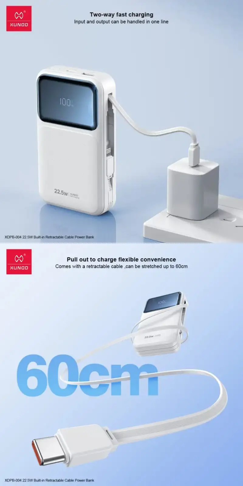 - The XUNDD XDPB-004 is a powerful 22.5W fast-charging power bank with a built-in retractable 60cm cable, making it the perfect on-the-go charging solution. Its 10000mAh lithium polymer battery provides ample power to keep your devices running throughout the day.