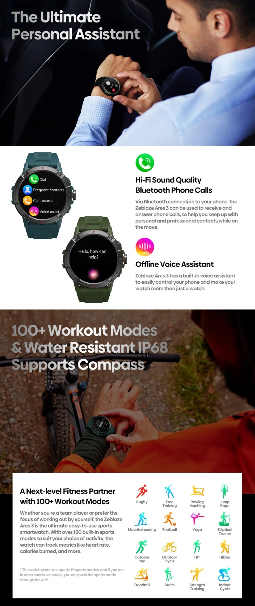 - The Zeblaze Ares 3 Rugged Bluetooth Calling Smartwatch combines durability with smart functionality, making it a perfect companion for both outdoor adventures and daily life. To start with, its voice calling features allow for seamless communication, providing one-touch connectivity, voice calling, and even a built-in voice assistant. Additionally, users can manage calls using the dial pad, check recent calls, view contacts, or reject unwanted calls with ease. Furthermore, the customizable theme styles, including list menu, tile menu, and arch bridge menu, offer a personalized user experience.
