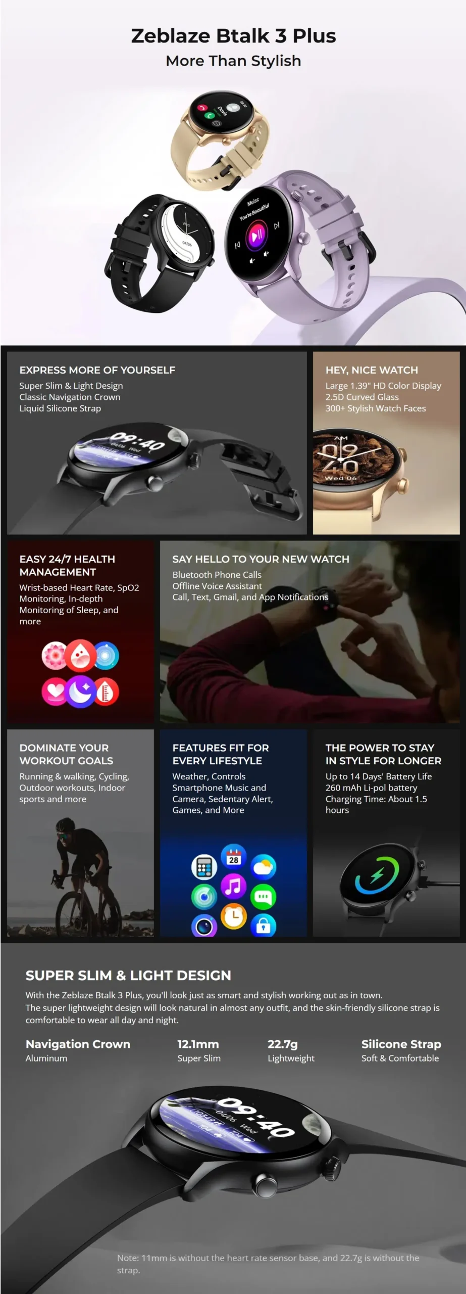 - Moreover, the super slim and light design of the Zeblaze Btalk 3 Plus enhances its appeal. At just 12.1 mm thick and weighing only 22.7 grams, it is incredibly comfortable to wear. Additionally, the skin-friendly liquid silicone strap adds to its wearability, ensuring it remains a pleasure to wear throughout the day.