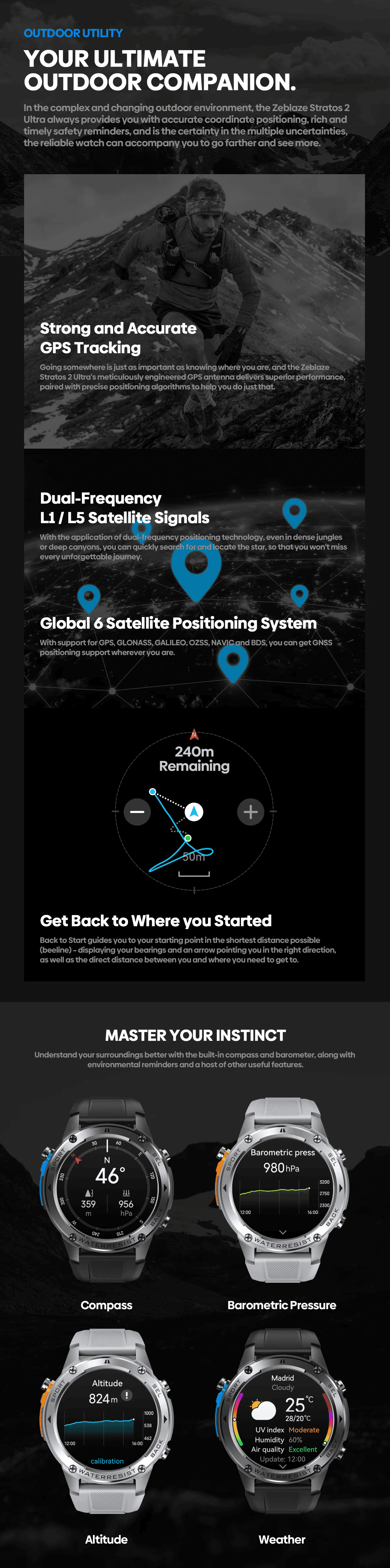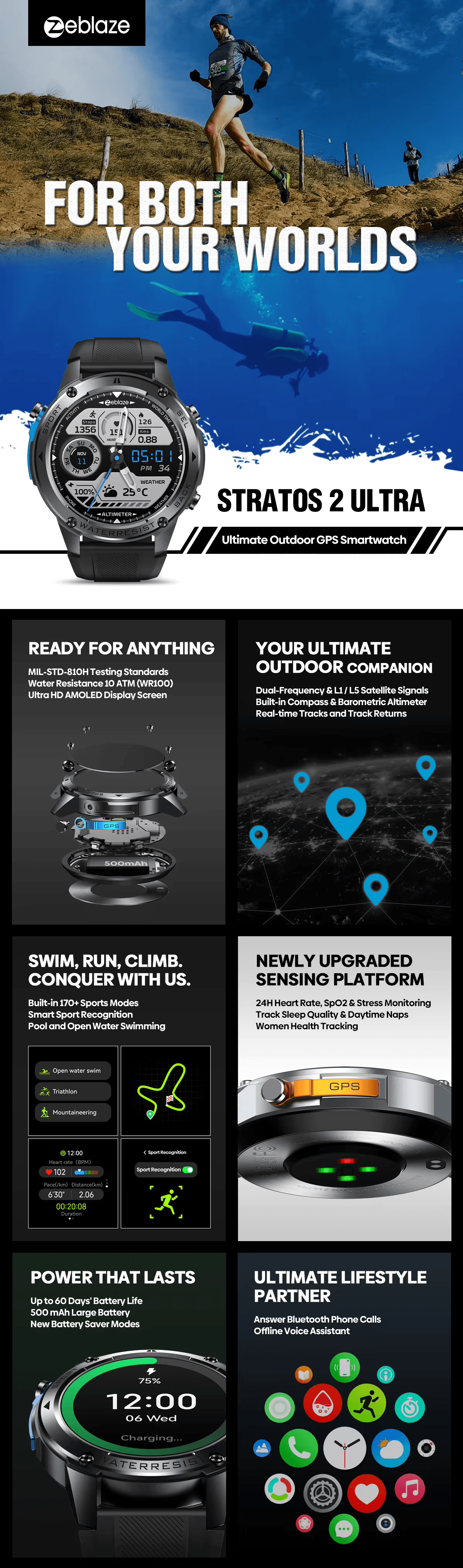 - For individuals who require functionality and durability in their outdoor experiences, Zeblaze created the Stratos 2 Ultra Rugged Outdoor GPS Smart Watch. This watch guarantees accurate tracking even in difficult conditions thanks to its dual-frequency and six satellite location systems. With a 1.43-inch screen size, 466*466 pixel resolution, and 1000 nits of brightness, its ultra HD AMOLED display is notable for providing a crystal-clear picture that is easily viewable in a variety of lighting circumstances.
