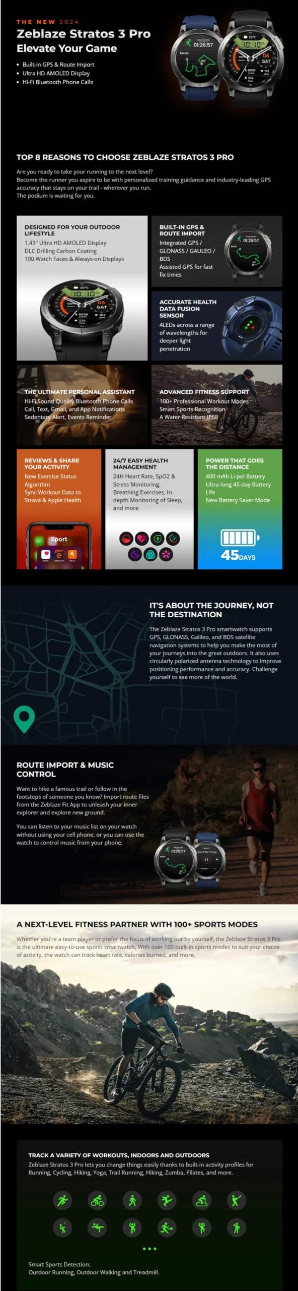 - Let’s now explore the main justifications for selecting the Zeblaze Stratos 3Pro. Its industry-leading GPS accuracy and tailored training advice, above all, take running to a whole new level.